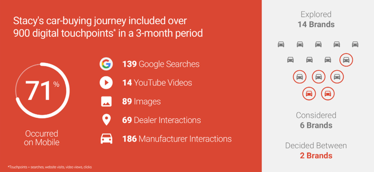 The average car buyer engages with over 900 digital touchpoints, including searches, dealer websites, reviews, and videos. This highlights the need for consistent, relevant content across all platforms.